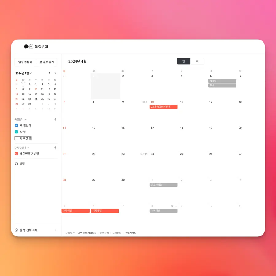 利用Kakao的聊天日历查看您的朋友的生日和纪念日,并将您的个人日历与之同步以管理日程和任务。